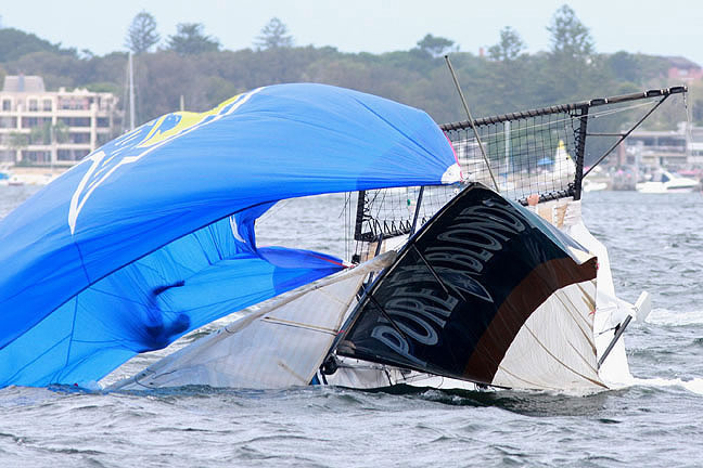 De’longhi-Rabbitohs and Pure Blonde exchanged the lead in a thrilling exhibition before Pure Blonde capsized. Matt Wark, Pure Blonde’s forward hand, broke his finger in the capsize forcing the skiff to retire.